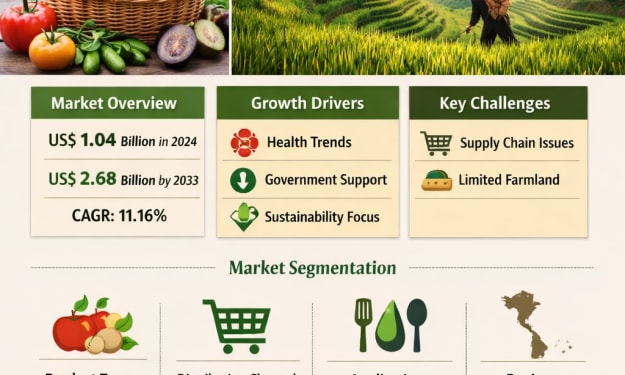 Vietnam Organic Food Market Overview The Vietnam Organic Food Market is entering a decisive growth phase, driven by changing consumer lifestyles, rising health awareness, and stronger focus on environmental sustainability. According to industry estimates, the Vietnam Organic Food Market is expected to reach US$ 2.68 billion by 2033, up from US$ 1.04 billion in 2024, expanding at a robust CAGR of 11.16% from 2025 to 2033. This impressive growth trajectory reflects a deep transformation in how Vietnamese consumers think about food quality, safety, and long-term wellbeing.