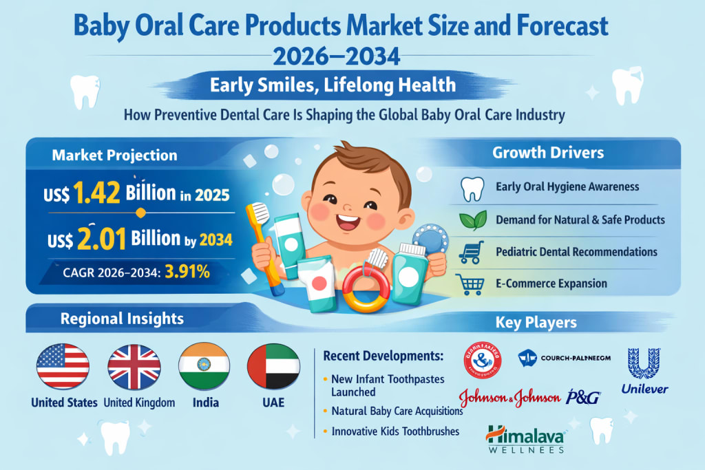The global baby oral care products market is steadily emerging as an essential segment within the broader baby care and healthcare industries. According to Renub Research, the Baby Oral Care Products Market is expected to reach US$ 2.01 billion by 2034, growing from US$ 1.42 billion in 2025, at a CAGR of 3.91% from 2026 to 2034. This growth is being driven by rising awareness of infant oral hygiene, increasing parental focus on preventive healthcare, stronger pediatric dental recommendations, and growing demand for safe, natural, and age-appropriate products.