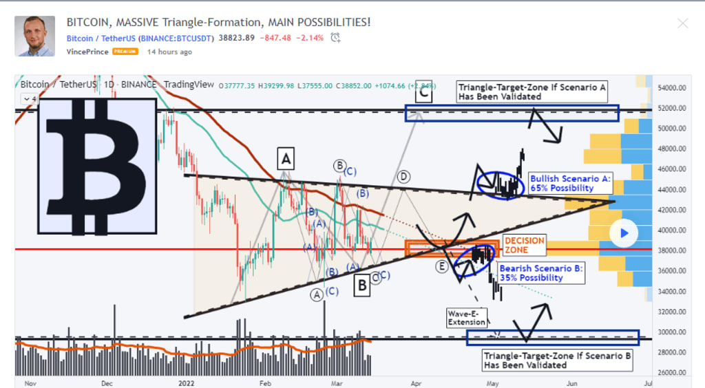 As when looking at my chart now we can watch there how Bitcoin moved into a huge range between 33.000 and 46.000 USD level, these two levels are the momentous boundaries in this whole range. Besides that Bitcoin is now building this paramount triangle formation where the lower boundary is steeper than the upper boundary. Within this triangle formation Bitcoin has the coherent wave-count with the waves A to C almost completed and now we can see that Bitcoin is setting up to form the wave D and the wave E. In the upcoming times, with the completion of the wave count, it is likely that the wave E finalizes within the main Decision-Zone marked in my chart in orange, from this level the final decisive movements will setup and Bitcoin will either conclude scenario A with breaking out above the Upper-Boundary as seen in my chart or the scenario B with breaking out below the lower boundary and also below the Decision-Zone.