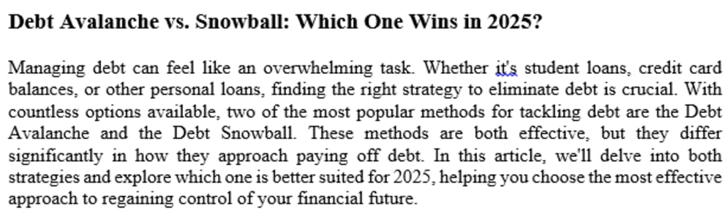 Managing debt can feel like an overwhelming task. Whether it's student loans, credit card balances, or other personal loans, finding the right strategy to eliminate debt is crucial. With countless options available, two of the most popular methods for tackling debt are the Debt Avalanche and the Debt Snowball. These methods are both effective, but they differ significantly in how they approach paying off debt. In this article, we'll delve into both strategies and explore which one is better suited for 2025, helping you choose the most effective approach to regaining control of your financial future.