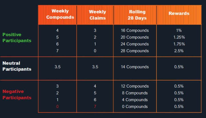 If however, you make no claims for 28 consecutive days, the yield increases to 2.5% per day and you will have to keep compounding every day without claiming to maintain it at 2.5%. You can continue to compound at 2.5% daily all the way until you reach the maximum number of 27,777.78 token balance per wallet.