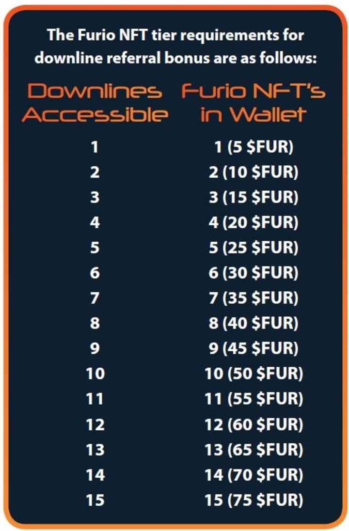 There are up to 15 levels in your downline that can earn referral rewards from, determined by how many NFT's you hold.