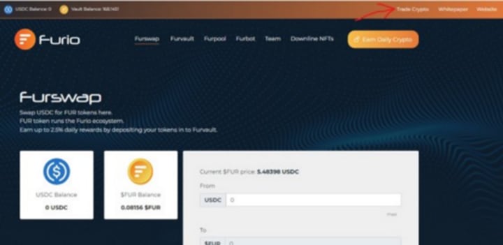 3. Once you have USDC, use the Furswap page to exchange USDC for $FUR and deposit into your vault here: https://app.furio.io/