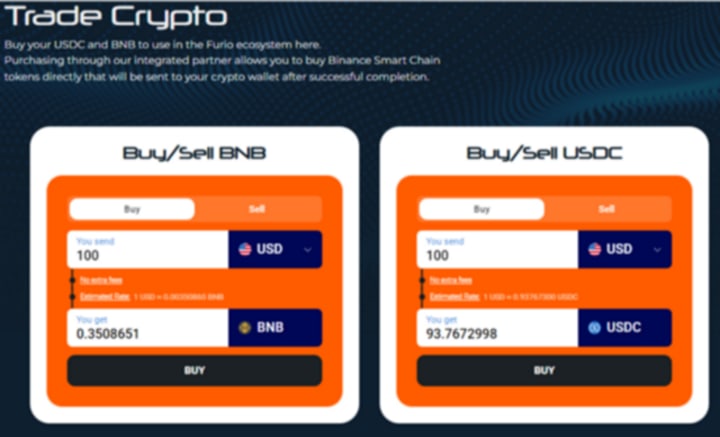 1.You'll need BNB in your wallet for gas fees. (Usually about 0.001 BNB per transaction). If you don't already have BNB, you can buy them directly on the Furio app - click the 'Trade Crypto' link in the top right corner