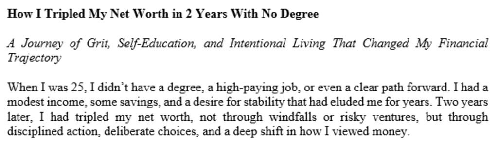 When I was 25, I didn’t have a degree, a high-paying job, or even a clear path forward. I had a modest income, some savings, and a desire for stability that had eluded me for years. Two years later, I had tripled my net worth, not through windfalls or risky ventures, but through disciplined action, deliberate choices, and a deep shift in how I viewed money.