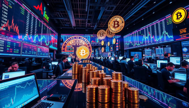 A bustling cryptocurrency trading floor with digital price charts displayed on large screens, traders focused on laptops, bright neon colors reflecting off glass surfaces, stacks of coins symbolizing various cryptocurrencies, a dynamic atmosphere filled with energy and movement, abstract representations of Bitcoin and other crypto coins in the background, showcasing fluctuations in trading volume and market activity.