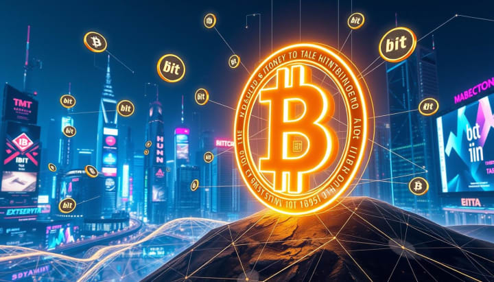 A futuristic digital landscape featuring a large, glowing Bitcoin symbol surrounded by floating IBIT tokens, interconnected with neon lines representing the exchange rate, set against a backdrop of a city skyline illuminated with high-tech billboards and vibrant colors, showcasing a blend of cryptocurrency technology and modern finance.