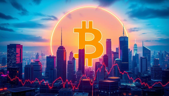 A futuristic city skyline with a giant Bitcoin symbol illuminated in the night sky, dynamic graphs and charts representing price fluctuations in the foreground, digital currency motifs, vibrant colors blending technology and finance.