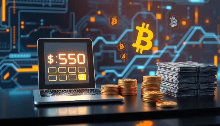 A sleek, modern digital workspace with a glowing calculator displaying a conversion from USD to BTC, surrounded by floating cryptocurrency symbols and stacks of dollar bills transitioning into Bitcoin coins, all set against a futuristic tech background with dynamic lighting effects.