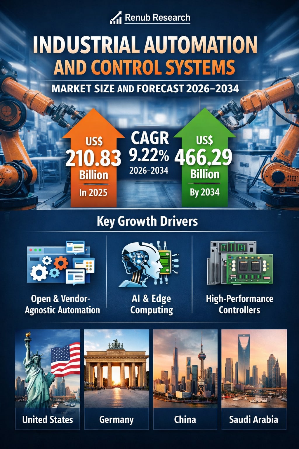 The Industrial Automation and Control Systems Market is at the center of the global industrial transformation. With Renub Research forecasting growth from US$ 210.83 billion in 2025 to US$ 466.29 billion by 2034, the industry is poised for sustained expansion driven by AI integration, smart manufacturing, and digital transformation initiatives.