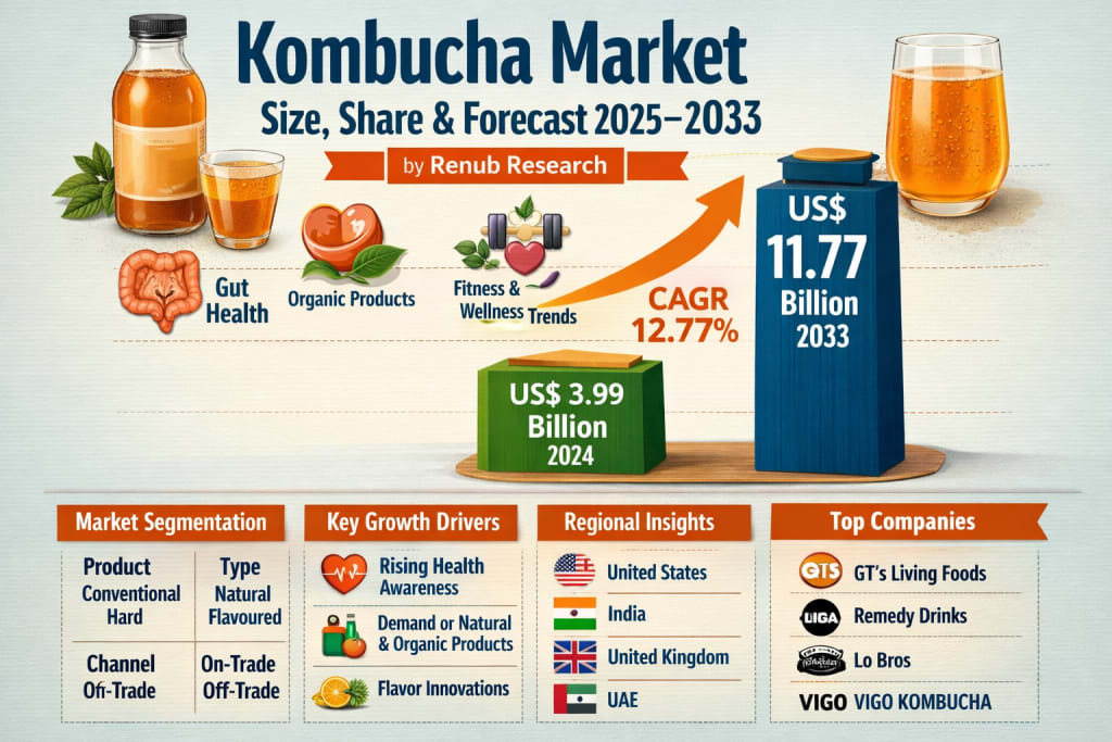 According to Renub Research, the global kombucha market was valued at US$ 3.99 billion in 2024 and is projected to reach US$ 11.77 billion by 2033, growing at a strong CAGR of 12.77% from 2025 to 2033. This impressive growth trajectory reflects a powerful shift in consumer preferences toward functional, natural, and low-calorie beverages.
