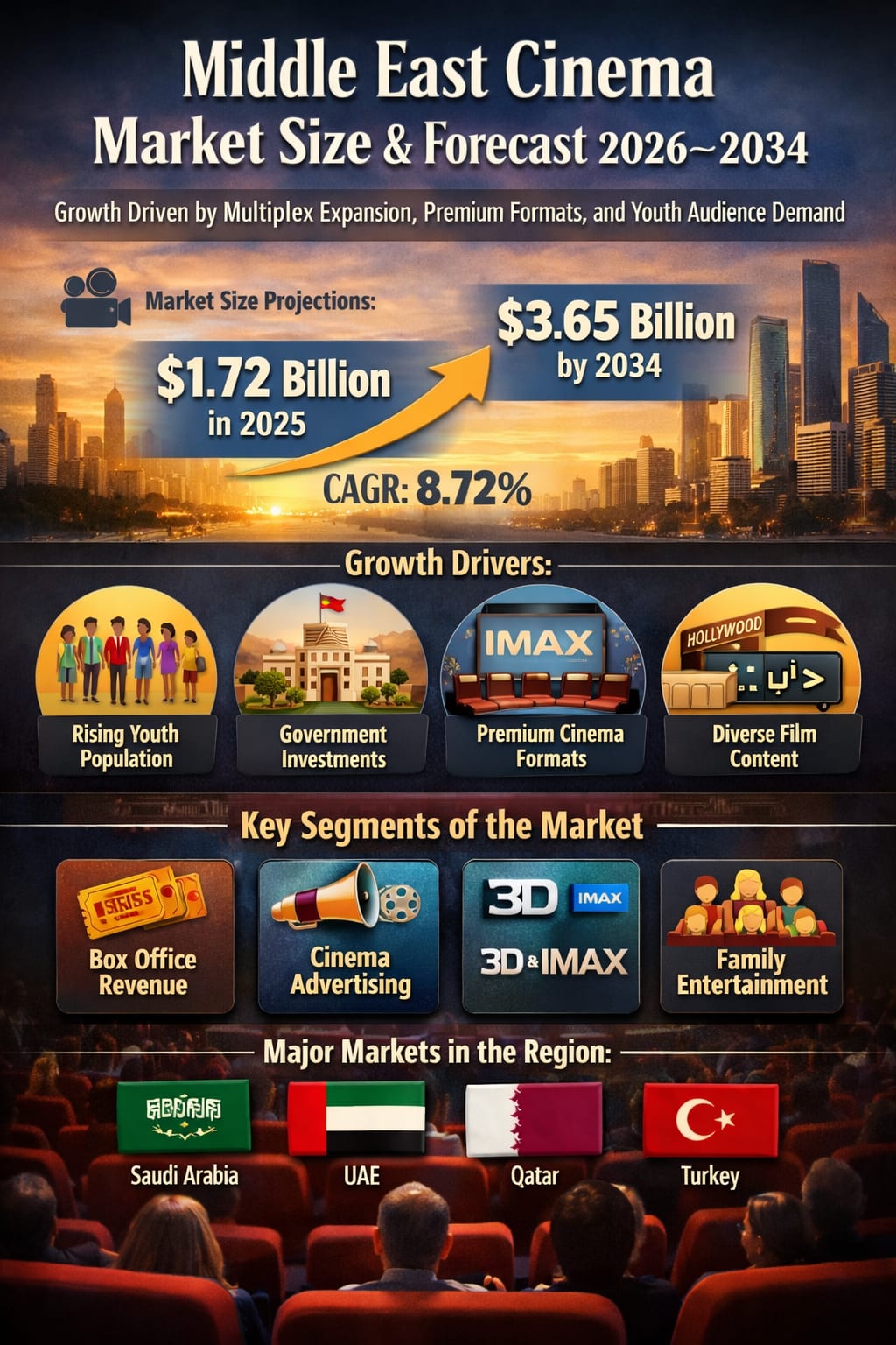 According to industry estimates, the Middle East cinema market is expected to grow from US$ 1,720.33 million in 2025 to US$ 3,650.87 million by 2034, registering a compound annual growth rate (CAGR) of 8.72% during 2026–2034. This impressive growth trajectory is being fueled by the rapid expansion of multiplexes, rising popularity of premium cinema experiences, increasing film content diversity, and sustained government initiatives aimed at strengthening the entertainment and cultural sectors.