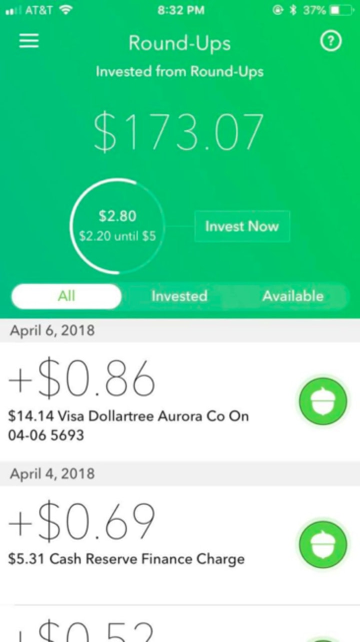Here's a screenshot of my Round Ups from April this year. I invested $173 from round-ups alone and I had only downloaded the app in February. At the time of these purchases, I definitely didn't feel like I was spending that much more by rounding up. But when I saw how quickly it added up, I was amazed.