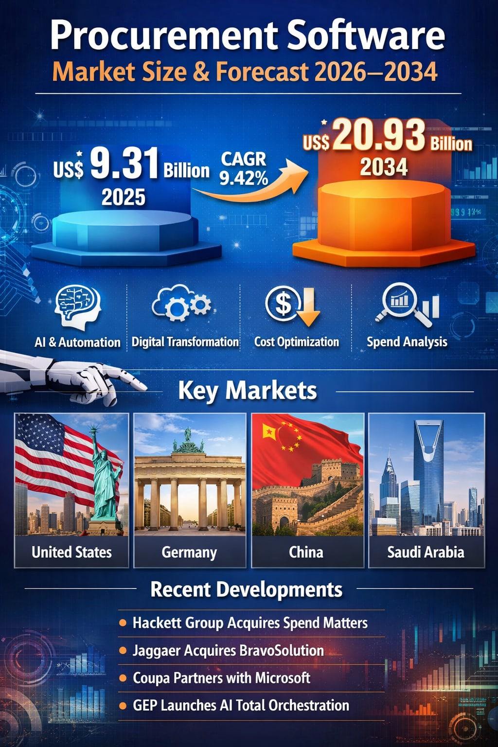 The global procurement software market is undergoing a fundamental transformation, driven by digitalization, AI adoption, and the growing strategic importance of procurement within enterprises. With the market projected to grow from US$ 9.31 billion in 2025 to US$ 20.93 billion by 2034 at a CAGR of 9.42%, the long-term outlook remains highly positive.