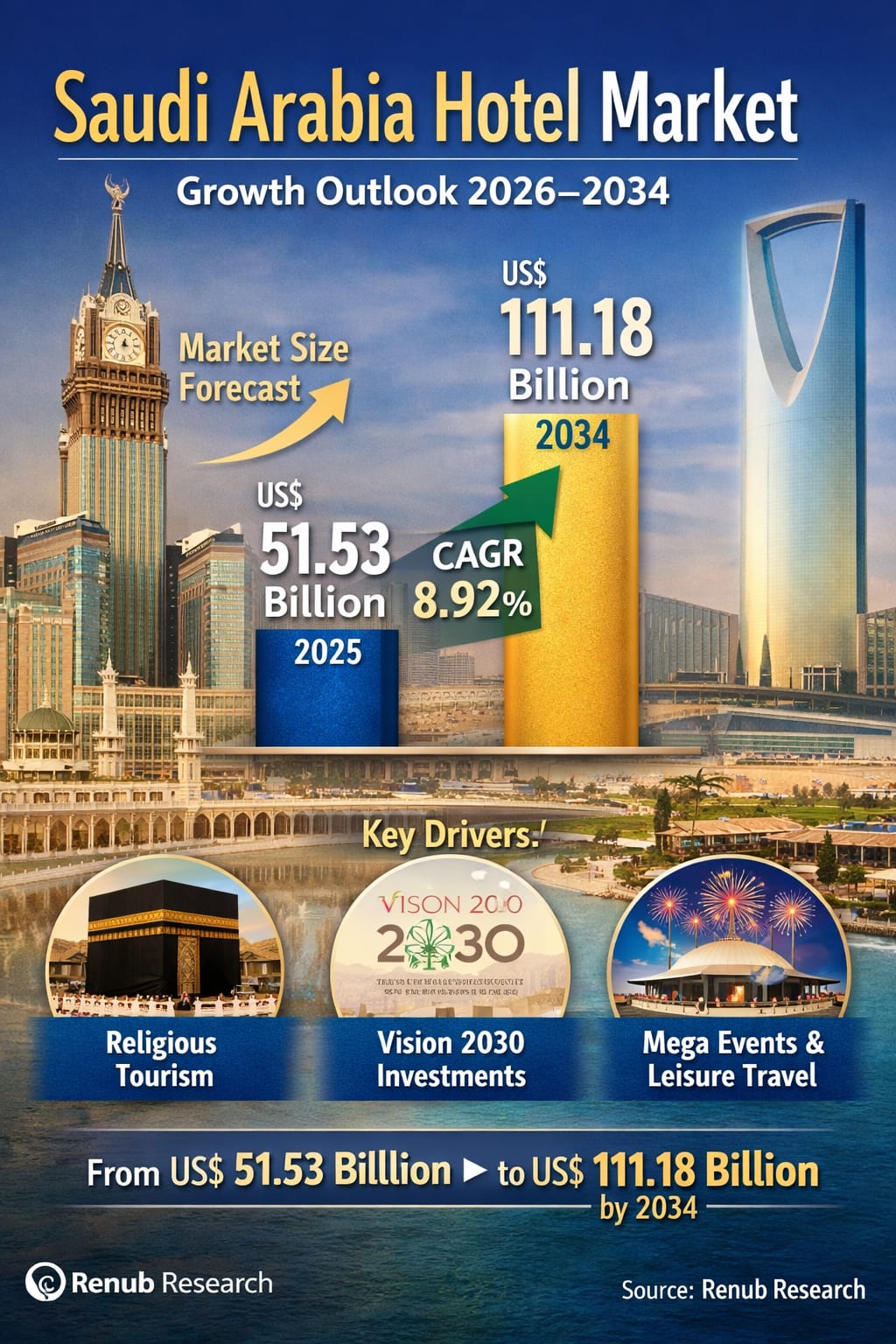 Renub Research projects a strong and sustained growth trajectory for the Saudi Arabia hotel market. The industry is forecast to expand from US$ 51.53 billion in 2025 to US$ 111.18 billion by 2034, registering a CAGR of 8.92% between 2026 and 2034.