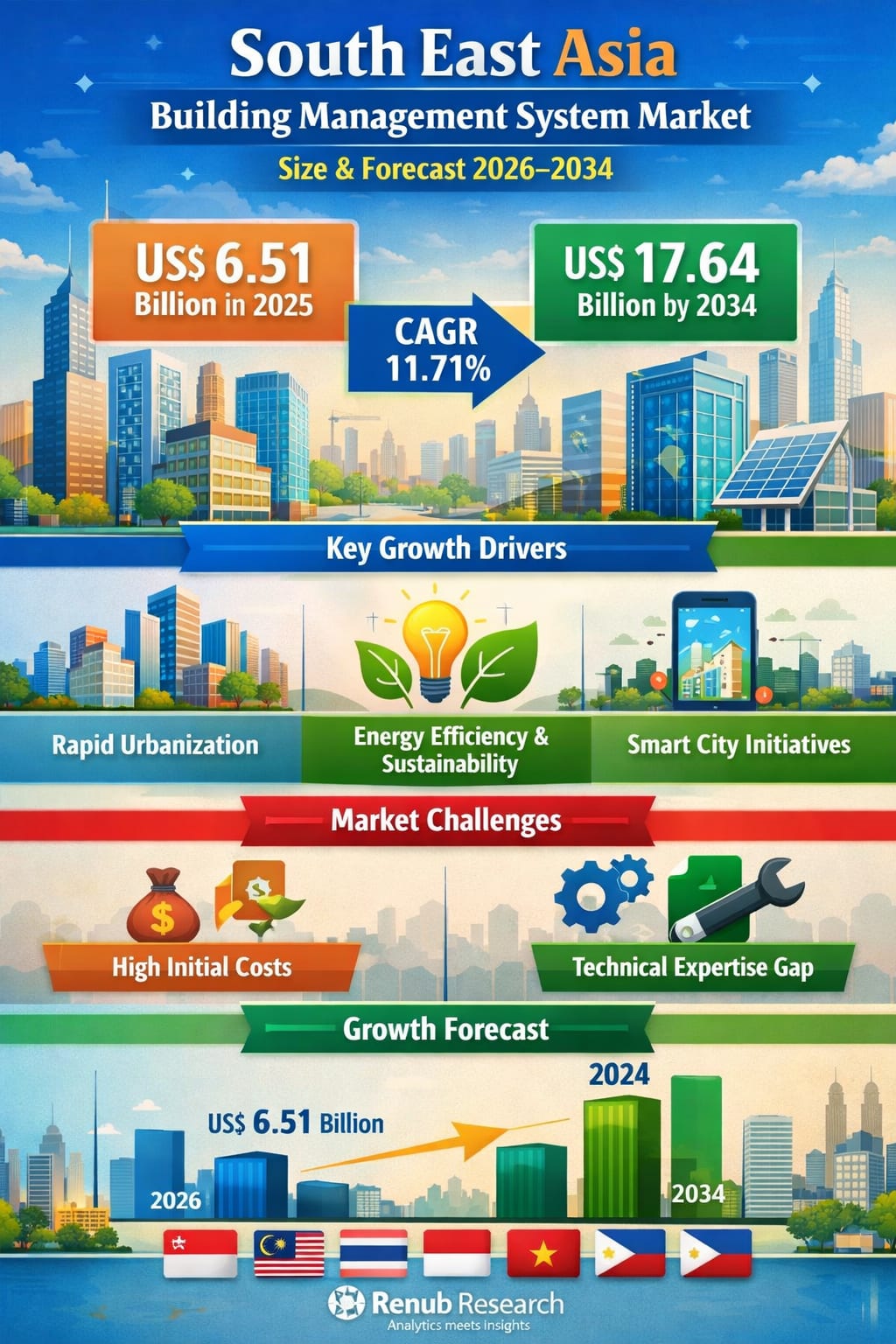 The South East Asia Building Management System (BMS) market is poised for strong and sustained expansion over the coming decade. According to Renub Research, the market is projected to grow from US$ 6.51 Billion in 2025 to US$ 17.64 Billion by 2034, registering a robust CAGR of 11.71% during 2026–2034.