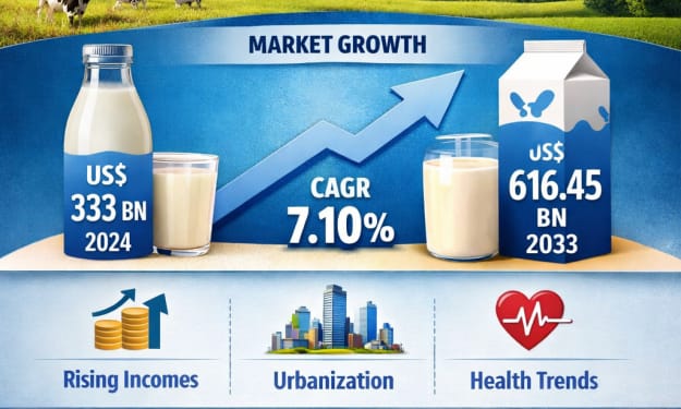 Introduction: A Region Powering Global Dairy Growth The Asia Pacific dairy industry is entering a decisive growth phase, driven by changing consumer habits, urban expansion, and rising health awareness. According to Renub Research, the market is expected to expand from US$ 333.00 billion in 2024 to US$ 616.45 billion by 2033, registering a strong compound annual growth rate (CAGR) of 7.10% between 2025 and 2033.