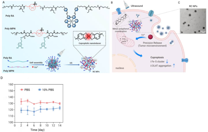Figure 1. RC NPs are biodegradable nanocarriers self-assembled from amphiphilic polymers Poly RA and Poly MPN[1]. A: Schematic diagram of the composition of RC NPs. Poly RA is a biodegradable polymer containing RBB molecules and thioketal bonds. On the one hand, this structure gives Poly RA the ability to generate ROS (Reactive Oxygen Species) On the other hand, ROS generation disrupts the thioketal bonds, leading to the degradation of Poly MPN. Poly MPN is an amphiphilic polymer synthesized by a similar method that has ROS-sensitive properties and can bind to metals. BD: Appearance and stability of RC NPs. RC NPs enter cells to promote cuproptosis, and TEM imaging analysis shows that they are uniformly distributed spherical structures (B, C). In PBS with or without 10% fetal bovine serum (FBS), the particle size of RC NPs did not change significantly within 14 days, showing considerable stability (D).
