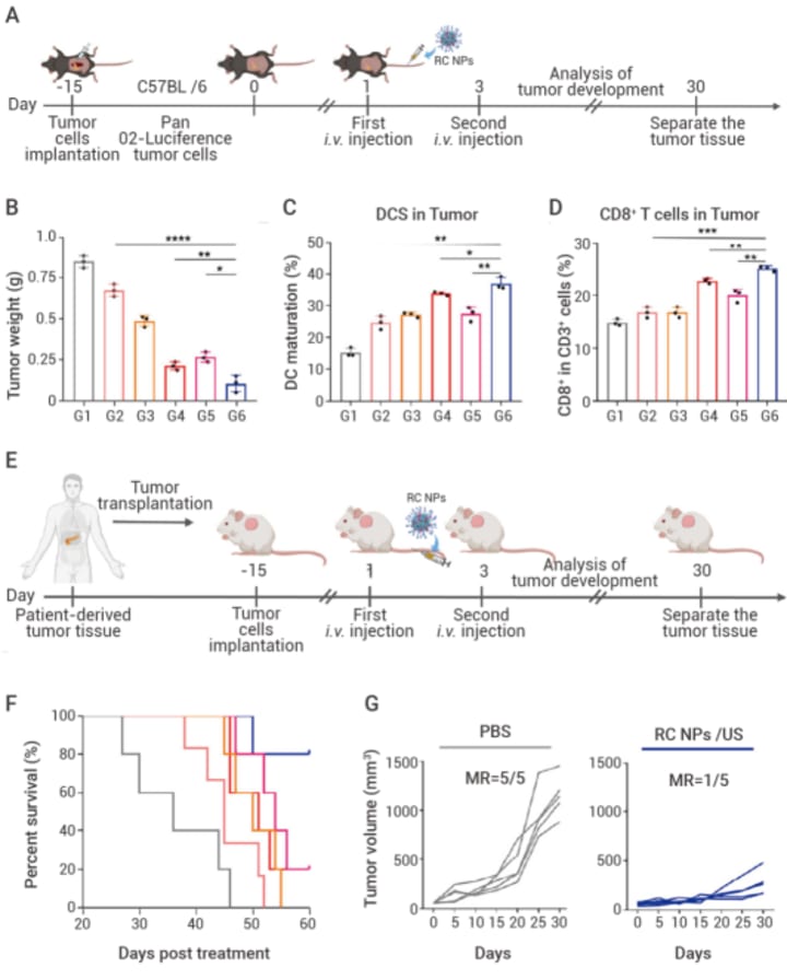 Figure 5. Antitumor effect of RC NPs combined with SDT in subcutaneous pancreatic cancer model and PDX model[1]. A-D: In vivo antitumor effect of RC NPs in an orthotopic model of pancreatic cancer in mice. The model was established by injecting luciferase-expressing Panc 02 cells orthotopically into the pancreas of mice. After the model was successfully established, RC NPs were injected twice via the tail vein (A). After adding ultrasound treatment, RC NPs/US effectively inhibited tumor growth, and the average tumor weight was only 1/6 and 1/2 of that in the GEM group and RC NPs group (B); and increased the number of mature DC cells in the tumor (C) and CD8+ T cell infiltration rate (D). The body weight of mice did not change significantly during RC NPs treatment. E-G: In vivo antitumor effect of RC NPs in patient-derived xenograft (PDX) model. Small pieces of fresh tumor tissue from clinical pancreatic patients were subcutaneously transplanted into mice to establish a PDX model. The therapeutic agent was injected into the mice via the tail vein on the 1st and 3rd days, respectively (E). The results showed that RC NPs/US effectively inhibited tumor growth, and the survival rate of mice was significantly longer than that of other groups (F); and the tumor volume of mice in the RC NPs/US group was significantly smaller than that of the control group (G).