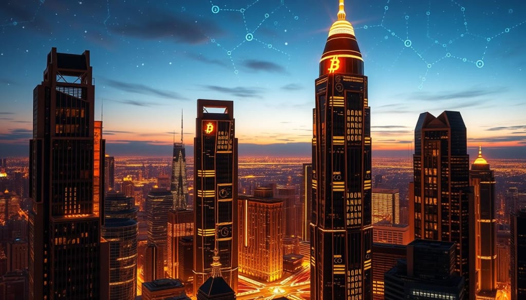 A futuristic cityscape with towering skyscrapers made of shining gold and silver, with a giant Bitcoin cap placed prominently on one of the buildings, glowing softly against a twilight sky filled with stars, surrounded by digital currency symbols and intricate blockchain patterns.