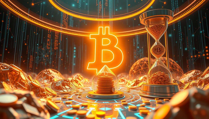 A futuristic digital landscape featuring a massive, glowing Bitcoin symbol at the center, surrounded by a visually striking representation of scarcity, such as an hourglass filled with golden coins slowly trickling down. The background should include abstract representations of blockchain technology and network nodes, with elements that evoke a sense of limit and exclusivity.