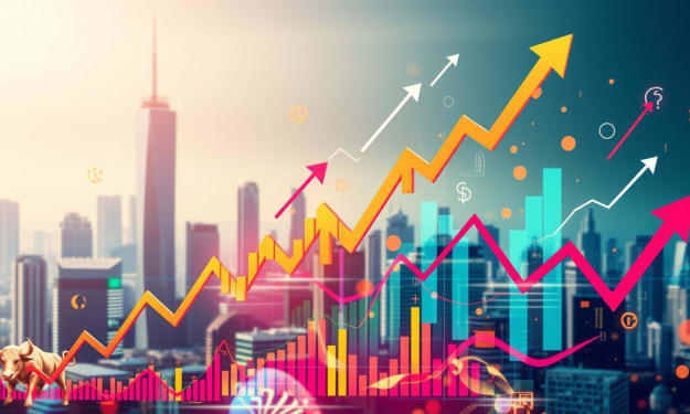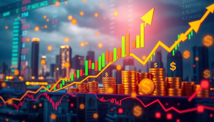 A vibrant financial chart shows upward trends with colorful candlestick patterns. It's surrounded by golden coins and dollar signs. The city skyline in the background symbolizes economic growth.