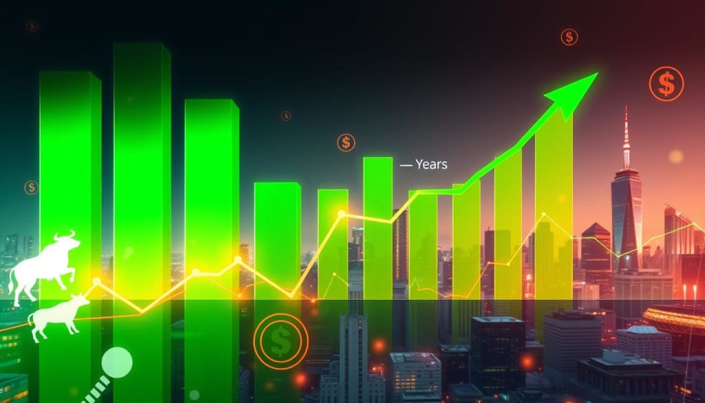 A dynamic stock market graph soaring upwards, with vibrant green bars representing growth over five years, surrounded by abstract financial symbols like bull and bear icons, and a backdrop of a futuristic city skyline, reflecting prosperity and success.