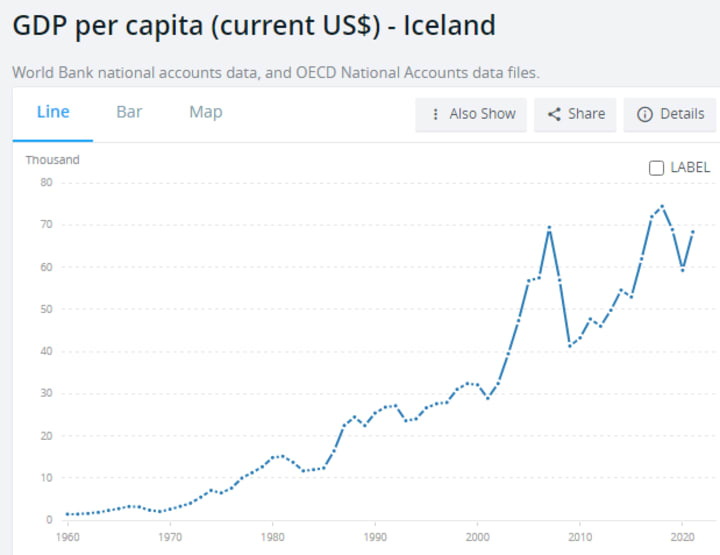 Iceland is a small country with only 366k inhabitants, But despite the size of its economy, its GDP per capita is 68k dollars, one of the highest in the world.