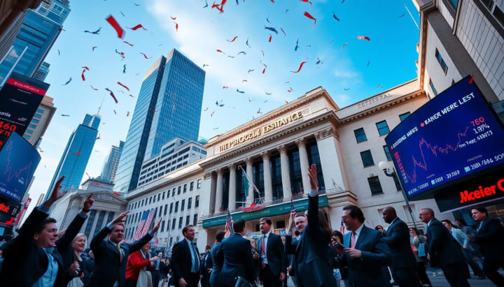 A bustling financial district with an iconic stock exchange building, traders and investors dressed in business attire celebrating, confetti falling from the sky, digital screens displaying stock prices and graphs, a vibrant atmosphere filled with energy and anticipation, blue skies above, modern skyscrapers in the background.