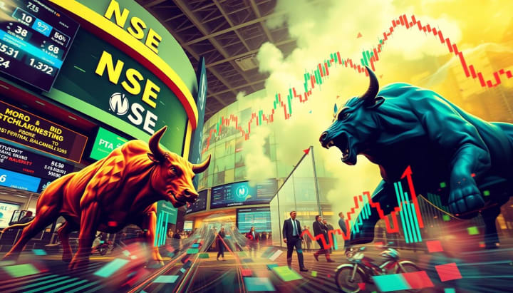 A dynamic stock market scene featuring the bustling atmosphere of the National Stock Exchange (NSE), with a bright and energetic color palette, dramatic bull and bear figures symbolizing market trends, and abstract representations of financial graphs and charts in motion, encapsulating the excitement of an IPO launch.