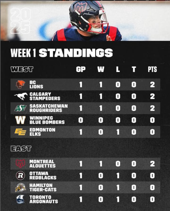 And there's the standings after opening week. In the West, the Elks were the only team who lost, while in the East, the Alouettes were the only team who won. The team who was off in Week 1: the Winnipeg Blue Bombers. The Bombers are coming off their third straight loss in the Grey Cup, and the schedule allows them an extra week to lick their wounds and prepare to begin their road to their sixth straight appearance in the big game, which will be in Winnipeg this season.