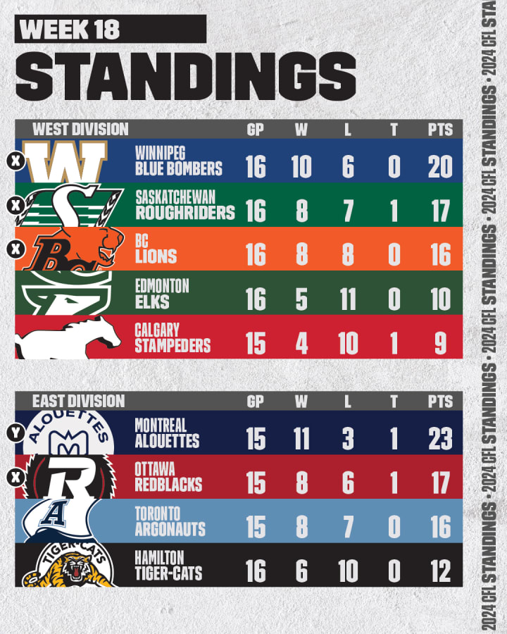 The month of October is a pivotal one in the Canadian Football League. It is the final month before the playoffs start, and of course, the format sees the top three teams in each division qualify. The first place teams get byes straight to the Division Finals, while the other two teams meet in the Division Semifinals. As a result, three teams will see their seasons end early. Entering Week 18, only two teams got in: the Montréal Alouettes and the Winnipeg Blue Bombers. The Alouettes locked up 1st place in the East and will host the Eastern Final, while the Bombers were looking to do the same out West.