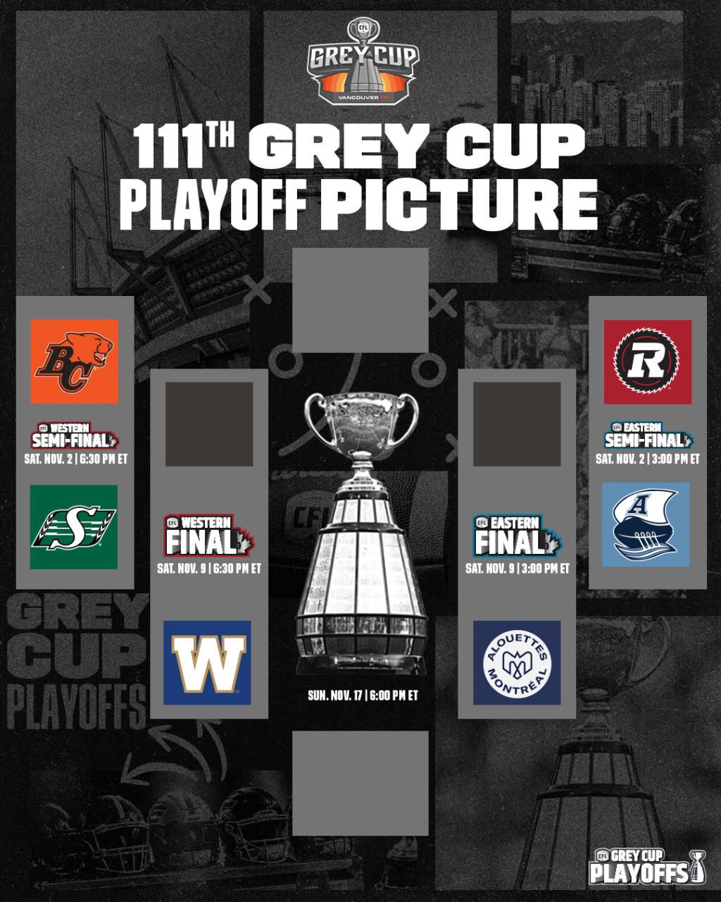The Division Semifinals will take place on Saturday, November 2 in Toronto, Ontario and Regina, Saskatchewan. The Division Finals will take place a week later on Saturday, November 9 in Montréal, Quebec and Winnipeg, Manitoba, and the 111th Grey Cup will take place on Sunday, November 17 in Vancouver, British Columbia. The Division Semis will air on TSN in Canada, with the Eastern game also airing on CTV. As for American and other international viewers, the games will air on CFL+.