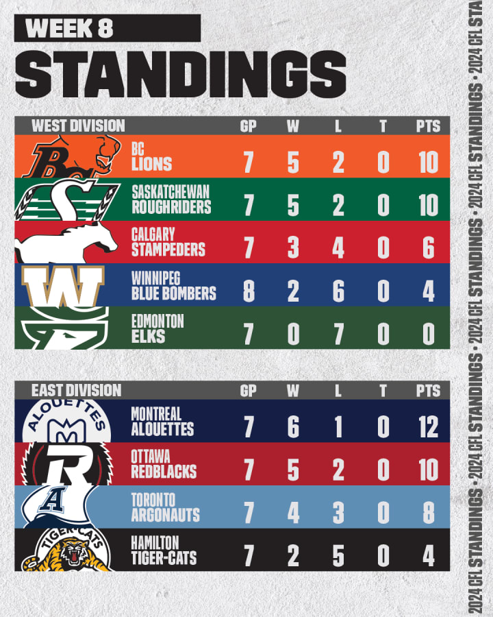 So with the loss, the Roughriders are now tied with the BC Lions (who were idle in Week 8) for first place in the West, and as I've said before, it looks like the Lions and Riders will be dueling for that top spot. Despite the Bombers' terrible start, they are close behind the Stampeders in the Western standings. Meanwhile, the East had a good week: all four teams won. So nothing changed as far as placement. The Argos definitely needed that OT win to keep pace with the Alouettes and Redblacks in the East. There's still plenty of time to climb that ladder.
