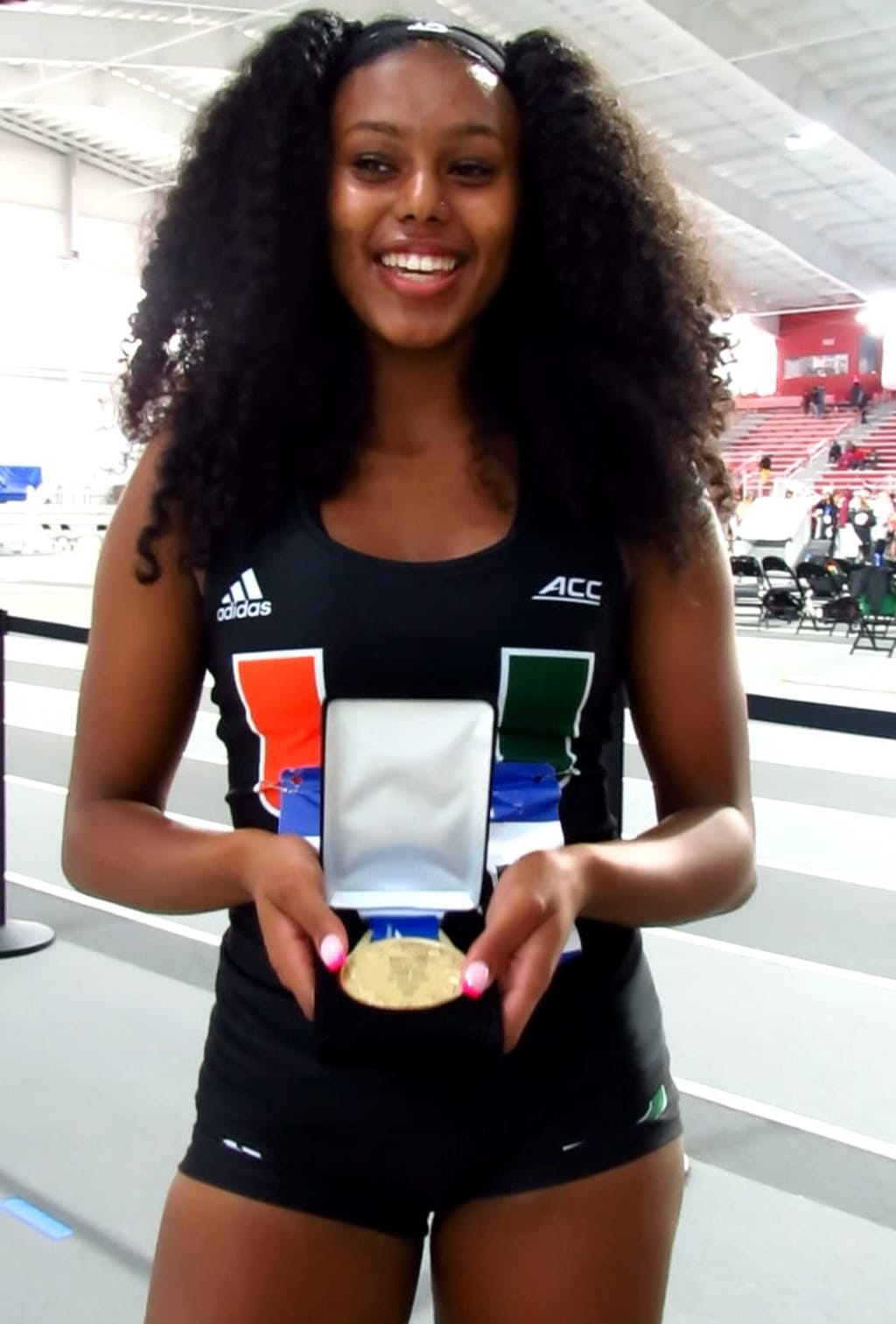 The 18-year-old freshman at University of Miami ran the final leg of the 1,600-meter relay at the ACC indoor championship meet 0n Feb. 25, in Louisville, Kentucky.