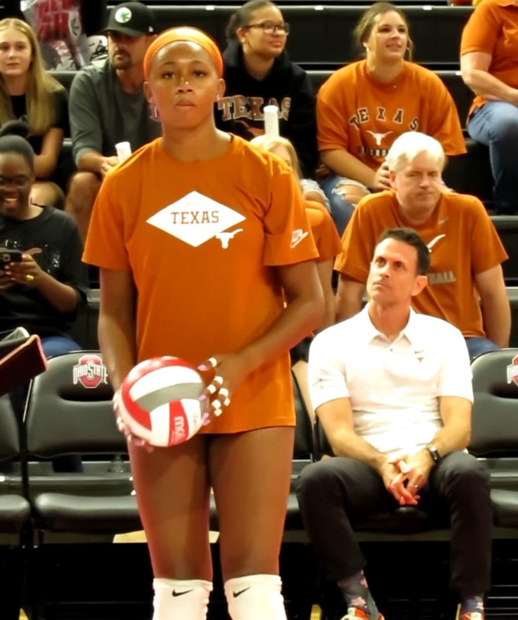 Madisen Skinner is another 6-2 outside hitter. She is one of many transfers on this Texas squad. Formerly a Kentucky Wildcat, Skinner looked well-adjusted to her new teammates with her strong performance in the second match against Ohio State.