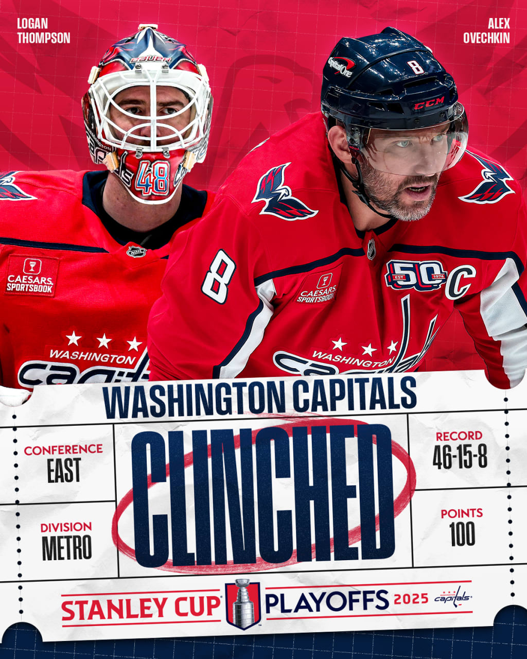 The moment finally came on March 20, and the scenario was announced. The Washigton Capitals had the chance to clinch, and they had three ways in. Option 1: win in regulation, and anything except an Islanders regulation win against the Canadiens. Option 2: win in OT/SO and the Islanders lose (doesn't matter how). Option 3: get one point, Columbus loses, and the Islanders lose in regulation. Simple, isn't it? The Caps took care of business; after the Jackets were shut out by the Panthers in OT, Washington won 3-2 over the Philadelphia Flyers in regulation. That meant all eyes were on the Isles/Habs game, but the Isles were up 3-1 in the third period. However, two Habs goals led to the game being tied with under three minutes left, and the countdown was on. After a few stoppages, the third period ended with the game tied at three, meaning that an Islanders regulation win could not happen. The Isles won in OT, but even so, the game reaching overtime officially placed the Capitals in the 2025 Stanley Cup Playoffs.