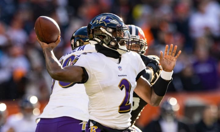 Week Fourteen (@ CLE): The Ravens suffered a blow to their offense, as Jackson would be sidelined due to injury, allowing Tyler Huntley to start at QB in Cleveland. The loss in Pittsburgh, coupled with the New England Patriots' victory, knocked the Ravens out of the #1 spot, but they still led the AFC North entering their second meeting against the Browns. The Browns smelled the blood in the water; they were looking to avenge their failure to defeat the Ravens two weeks earlier (despite intercepting Jackson four times), and they were doing a good job of that. Of course, nothing comes easy for the Browns, as Huntley led a late comeback, but couldn't finish it. Browns won 24-22, handing the Ravens their second straight loss.