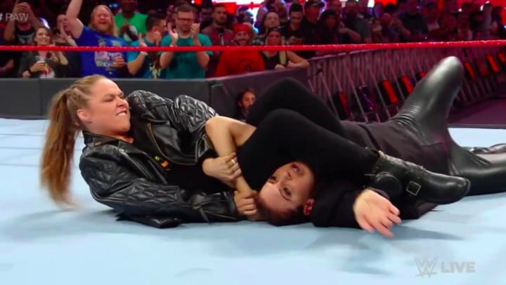 She goes down the ring and tries to tell everybody that she “respects Ronda Rousey and spoils the greatest fight." Then the fans chanted to her "you tapped out" repeatedly. Of course, Stephanie pulls the "Women's Evolution" card a few times.
