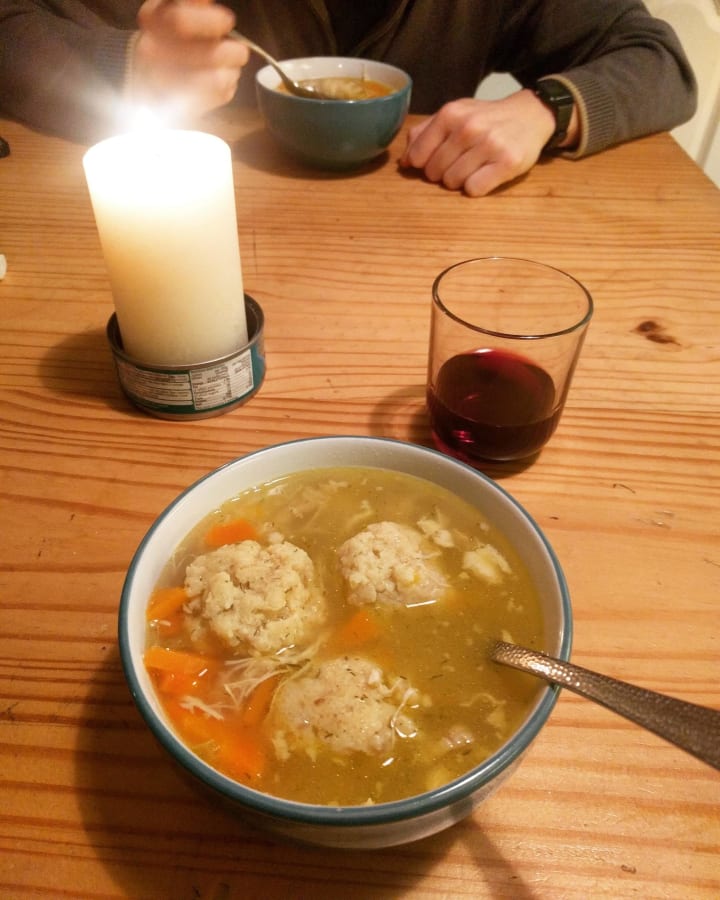 And the dish that sat at the altar of comfort and reliability, the dish that was nearly impossible to corrupt and could always be counted on to vanquish whatever enemy was at the gate, the dish that was the antithesis of all things cold and lonely and despairing was, of course, matzo ball soup - the dish that Ari’s grandparents had brought over from Poland just before the war.