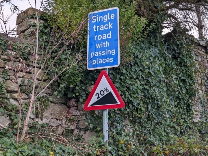 The distance is about a mile and a half from April Cottage where I stay and after a quarter of a mile, there is an ominous sign that says the gradient I will be walking will be twenty per cent that's a one-foot rise for every five feet you walk. After about a mile it sort of levels off and becomes a little less hard to walk.