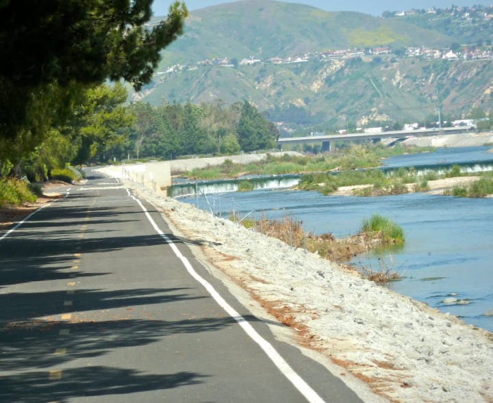 The Santa Ana River Trail is a scenic pedestrian route. There is a paved biking trail that stretches along the Santa Ana River. The river trail spans 110 miles from the San Bernardino Forest to the Pacific Ocean at Huntington Beach.