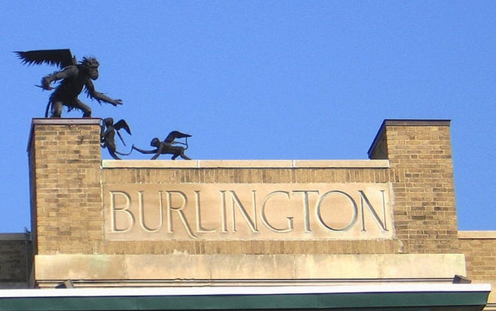 See the flying monkey sculptures in Burlington that adorn the roofs of two signature buildings in the harbor. The first two steel sculptures were created in the 1970s by Steve Larrabee to expand upon the Wizard of Oz theme of a now-defunct local waterbed store that was called Emerald City. After the closing of the store, the monkey sculptures were moved around and finally found their new home on the roof of One Main, a tall stone building, with a backdrop of the Adirondack Mountains across the lake.