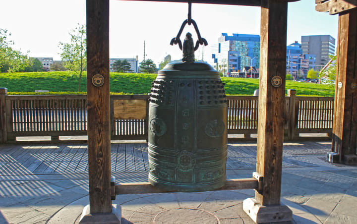 In the park is the giant “Friendship Bell” housed in a large wooden gazebo.