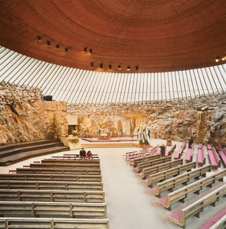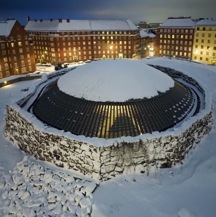Temppeliaukio Rock Church is located north of Helsinki's Hietaniemi area. It was designed by Timo and Tuomo Suomalainen in the late 1960s. The underground interior of the church was carved directly out of and built into the ancient solid rock of the Helsinki peninsula.