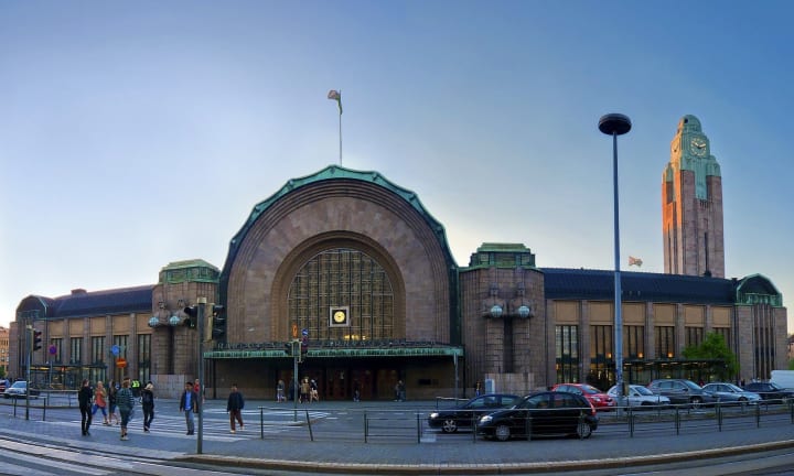Helsinki Railway Station is an impressive example of Art Nouveau. Its 48-meter high clock tower was the inspiration for the 1922 Chicago Tribune Tower which was America's first skyscraper. Inside the railway station are arched halls and carved panels decorating the walls.