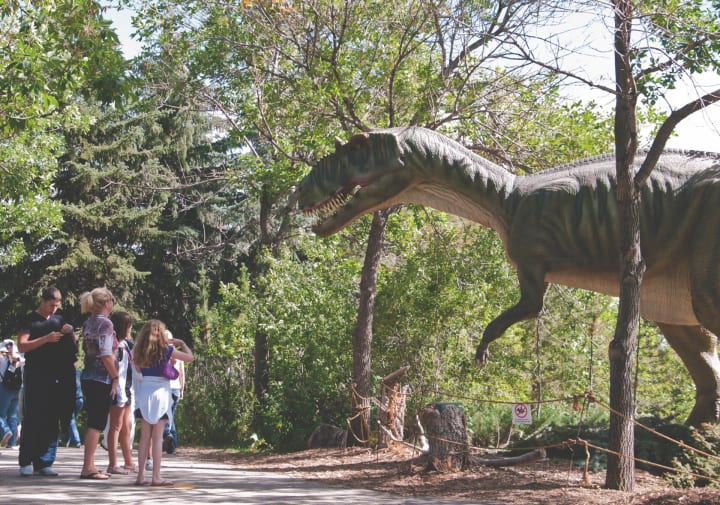 Children enjoy the Prehistoric Park attraction with full-sized replica dinosaurs.