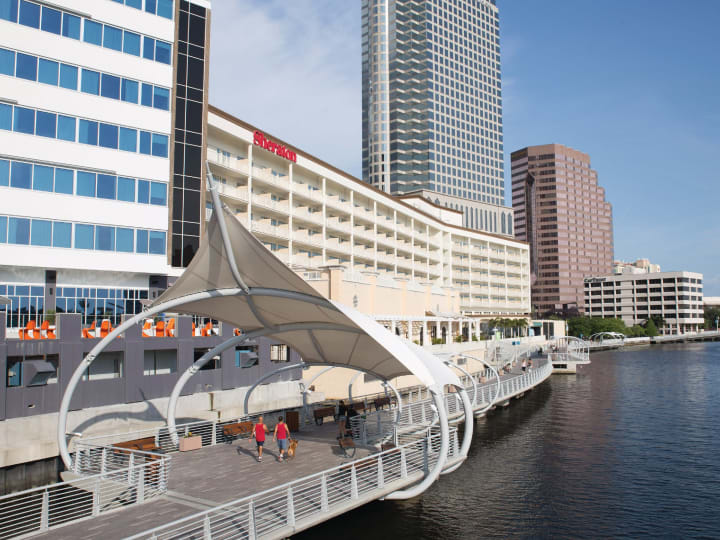 The Tampa Riverwalk in downtown Tampa Bay stretches along the Hillsborough River. Your walk will take you to the:
