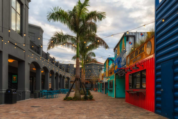 At the center of the park is a 40-foot waterfall. There are outdoor art installations, plenty of shops, and restaurants.