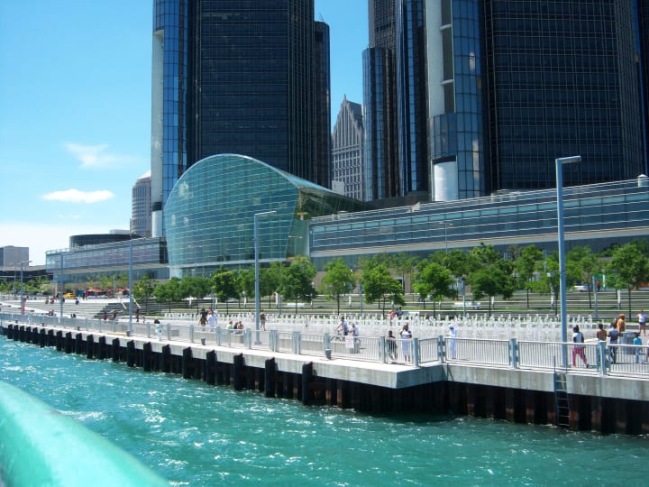 At the GM Plaza and Promenade is the Renaissance Center with seven towering skyscrapers.